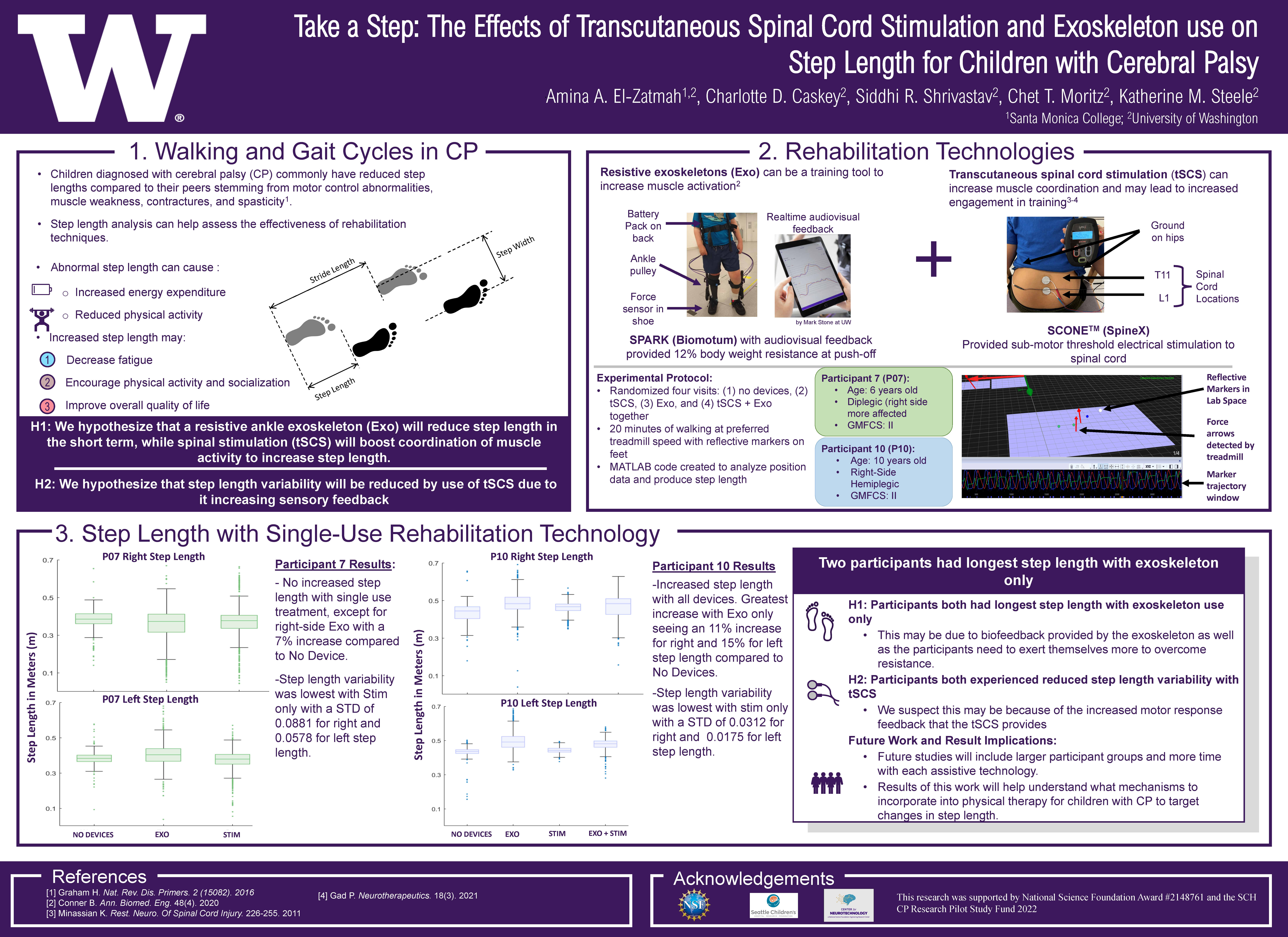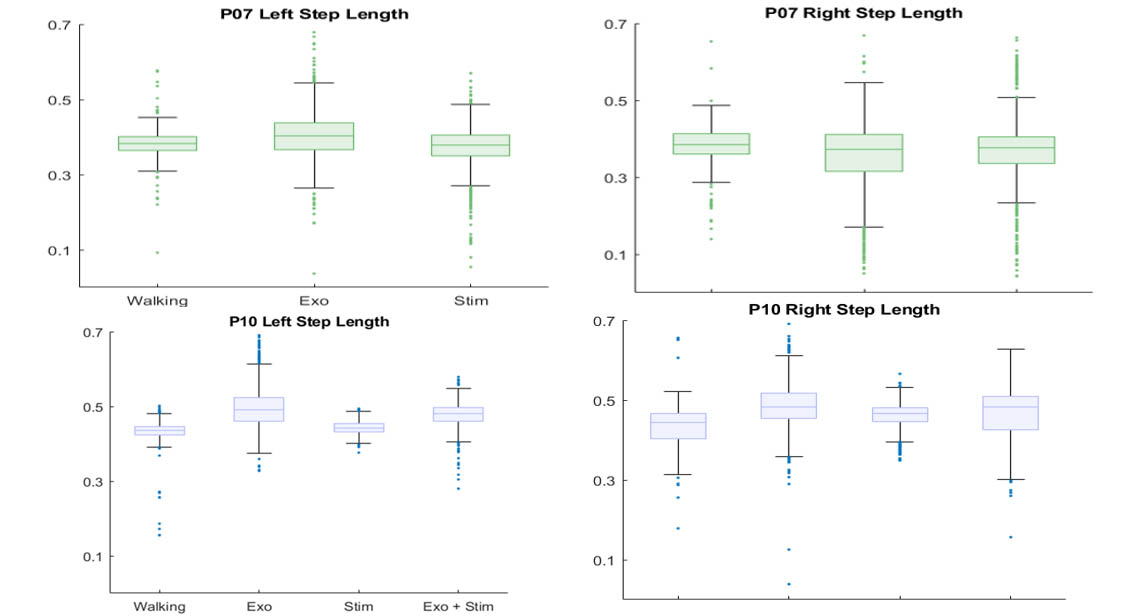 As a researcher on this project, beyond getting to engage with the Exoskeleton and Spinal cord stimulation hardware, I created computational code to analyze gait cycles. By use of infrared markers my team collected data on ten participants in a study group while they used the exoskeleton, spinal cord stimulation and both technologies. I then processed this data through Qualisys Track Manager and converted this data into a matrix for each session. Creating a MATLAB and Python code I was able to derive information such as step length from the matrix data. My work and code will be used in both novel studies of these devices to continue discovering the effects of these technologies in therapy settings for individuals with neuromuscular disabilities.